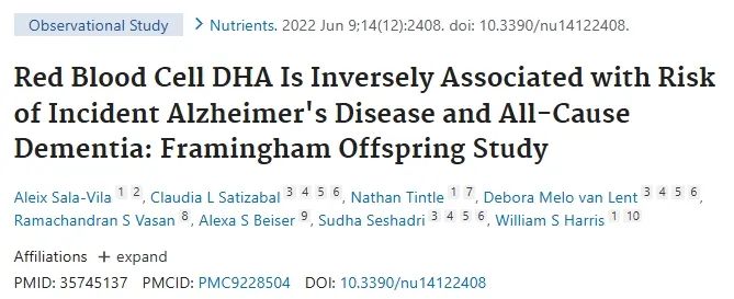 发表在《Nutrients》期刊上的一篇论文通过对1490名65岁及以上参与者的数据收集及分析得出结论:血液中DHA水平较高的人患阿尔茨海默症的可能性比水平较低的少49%。而增加DHA的摄入量会降低患阿尔茨海默症(AD)的风险。